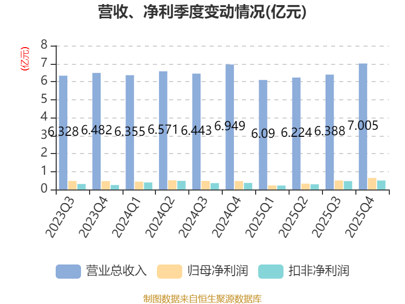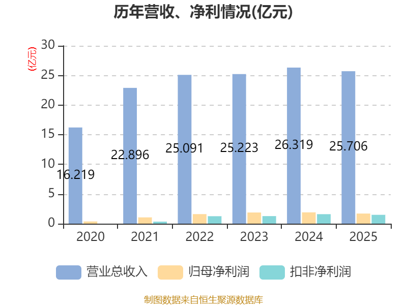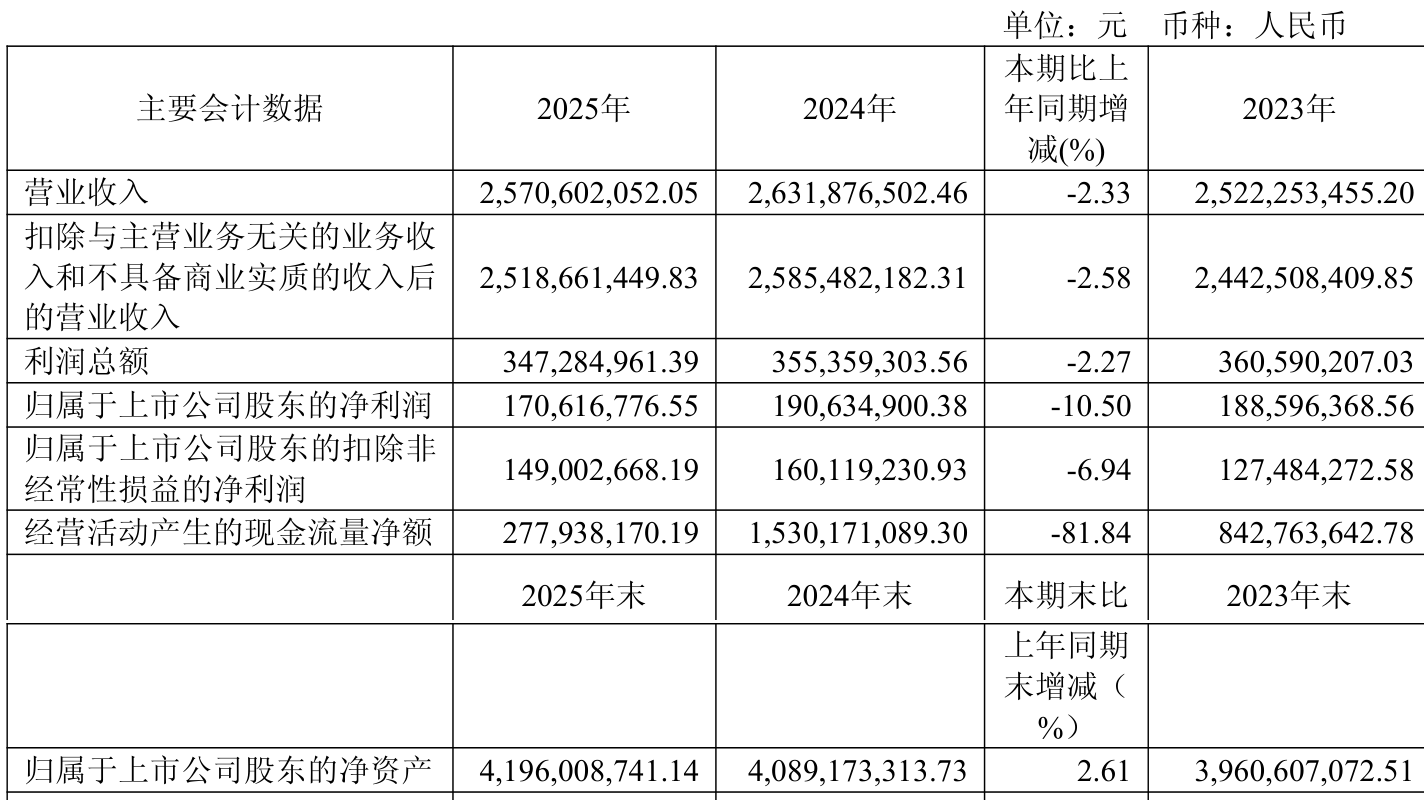 中证智能财讯连云港(601008)3月24日披露2025年年度报告。2025年,公司实现营业总收入25.71亿元,同比下降2.33%;归母净利润1.71亿元,同比下降10.50%;扣非净利润1.49亿元,同比下降6.94%;经营活动产生的现金流量净额为2.78亿元,同比下降81.84%;报告期内,连云港基本每股收益为0.14元,加权平均净资产收益率为4.14%。公司2025年度分配预案为:拟向全体股东每10股派现0.6元(含税)。