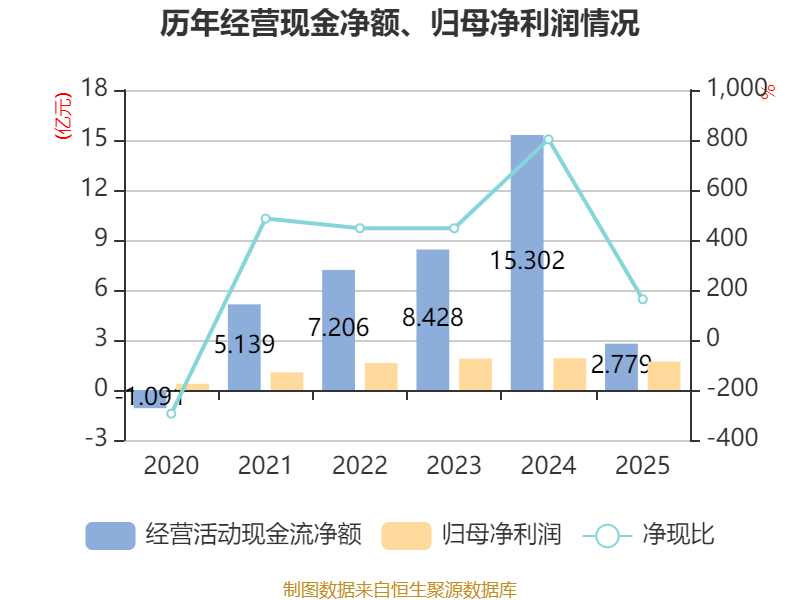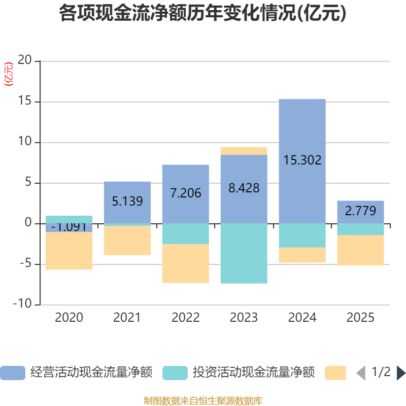 截至2025年,公司经营活动现金流净额为2.78亿元,同比下降81.84%;筹资活动现金流净额-3.72亿元,同比减少1.87亿元;投资活动现金流净额-1.48亿元,上年同期为-2.99亿元。